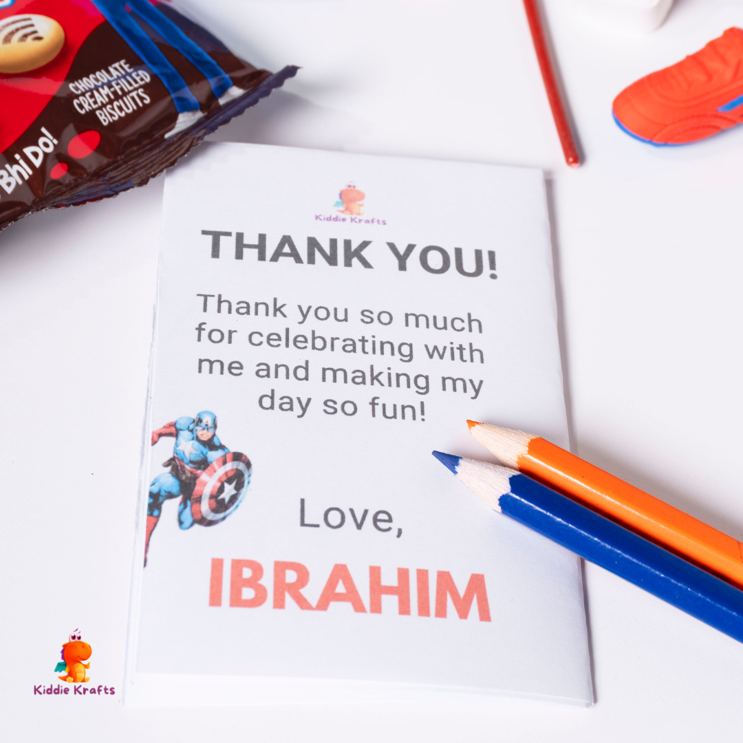 Our Avengers Sweet Pouch is a fun and colorful party favor, specially curated for kids’ birthdays and celebrations. Each pouch comes in a customized Avengers–themed bag, personalized with the child’s name and age.