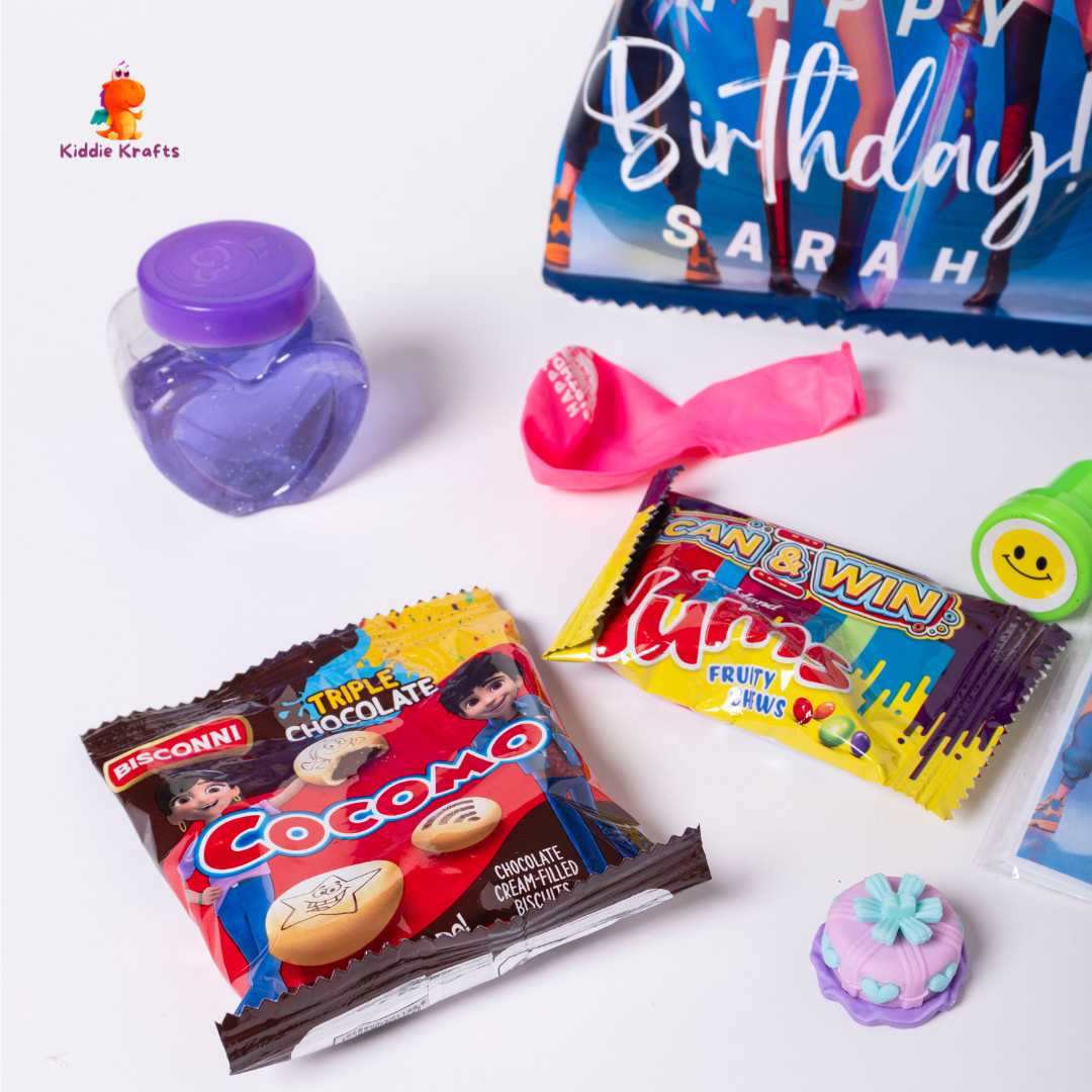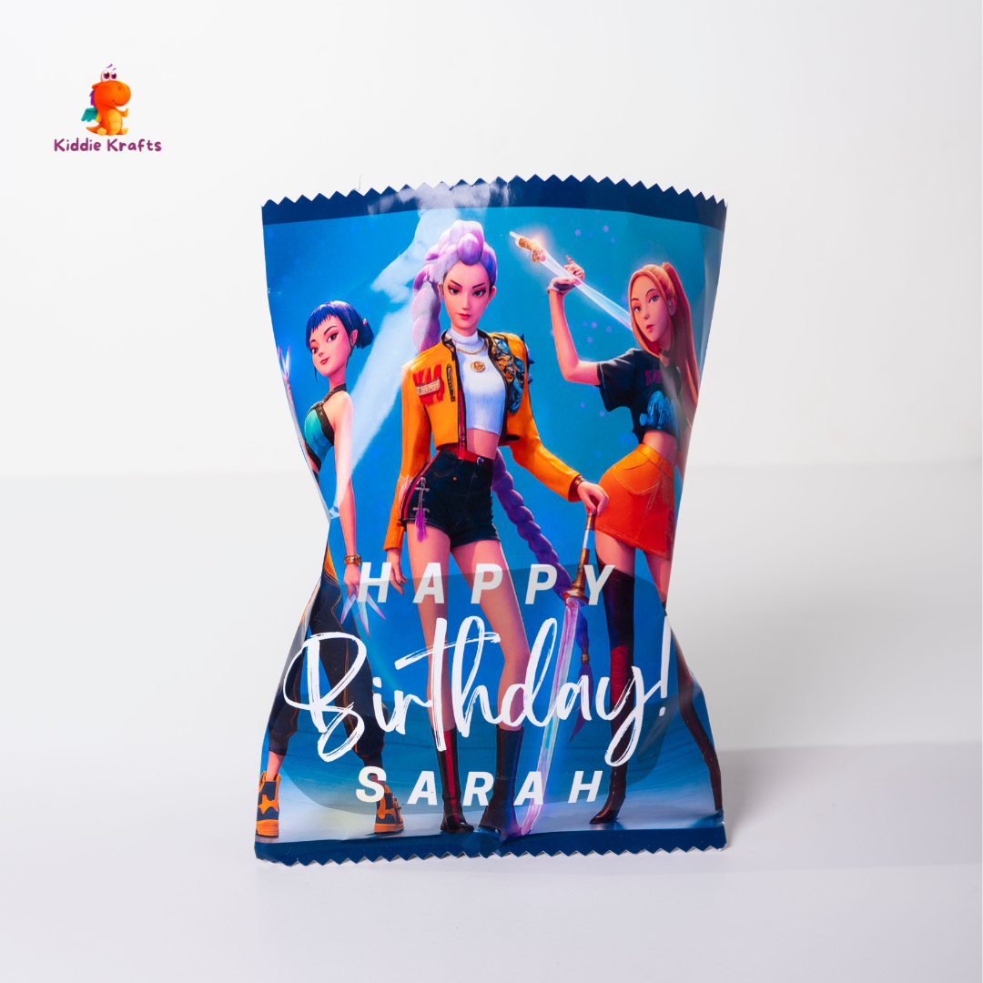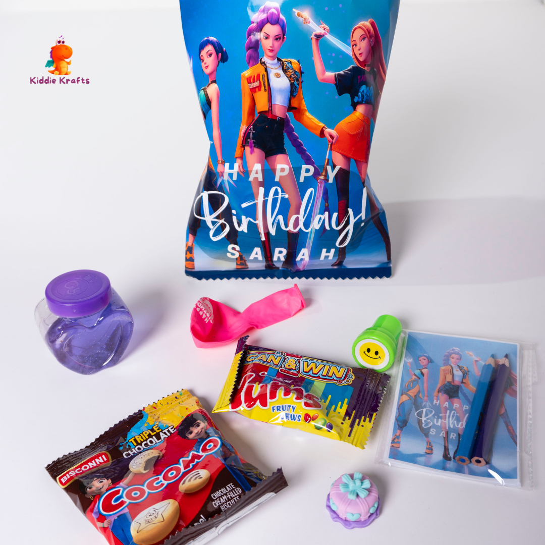 Our K-Pop Demon Hunters Theme Sweet Pouch is a bold and trendy party favor, perfect for kids and tweens who love action-packed, K-pop–inspired themes. Each pouch comes in a customized K-Pop Demon Hunters–themed bag, personalized with the child’s name, making it an exciting return gift for birthdays and celebrations.