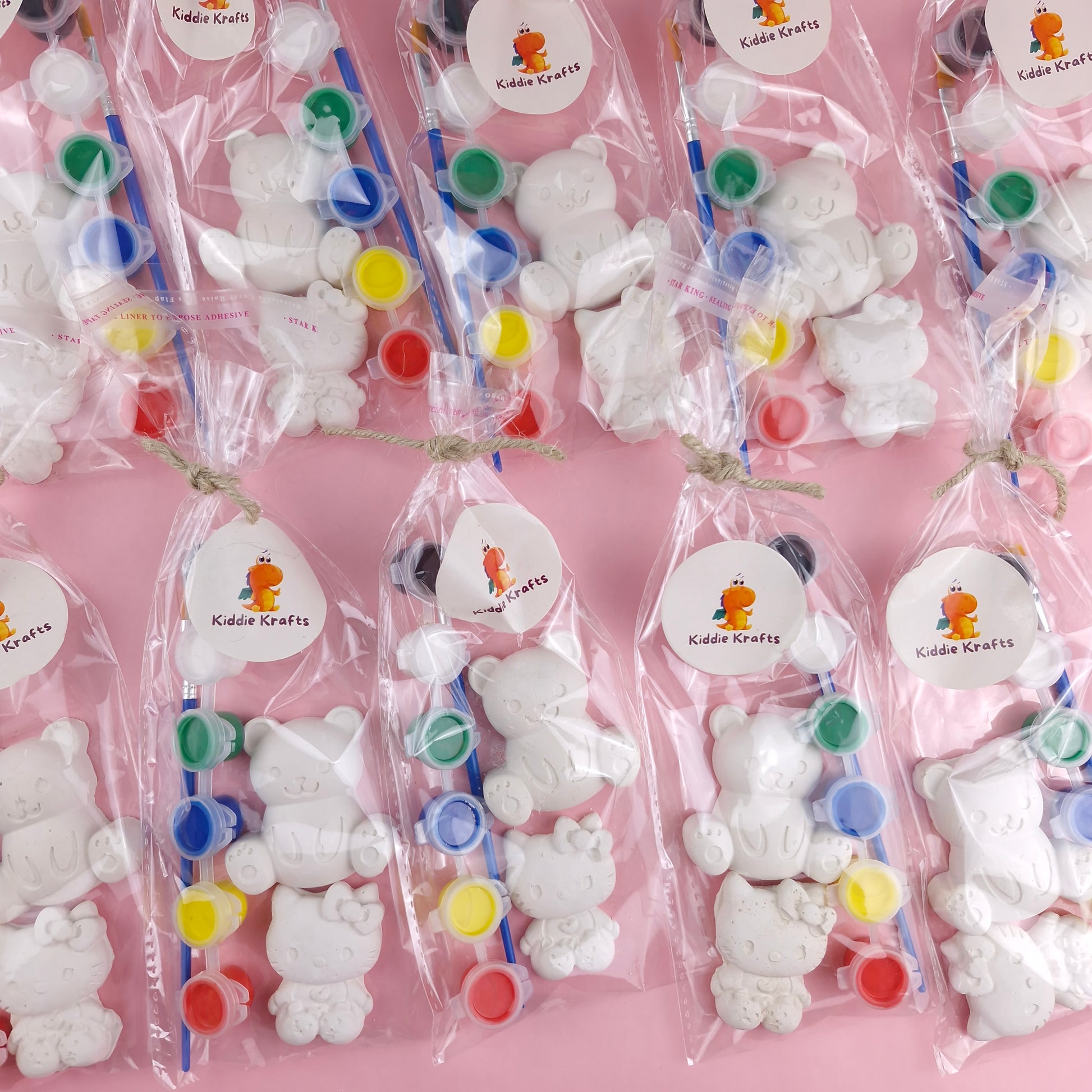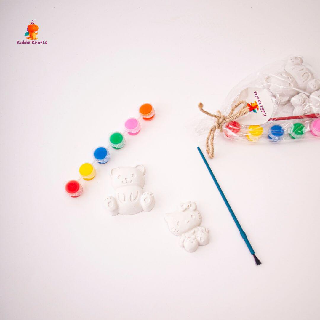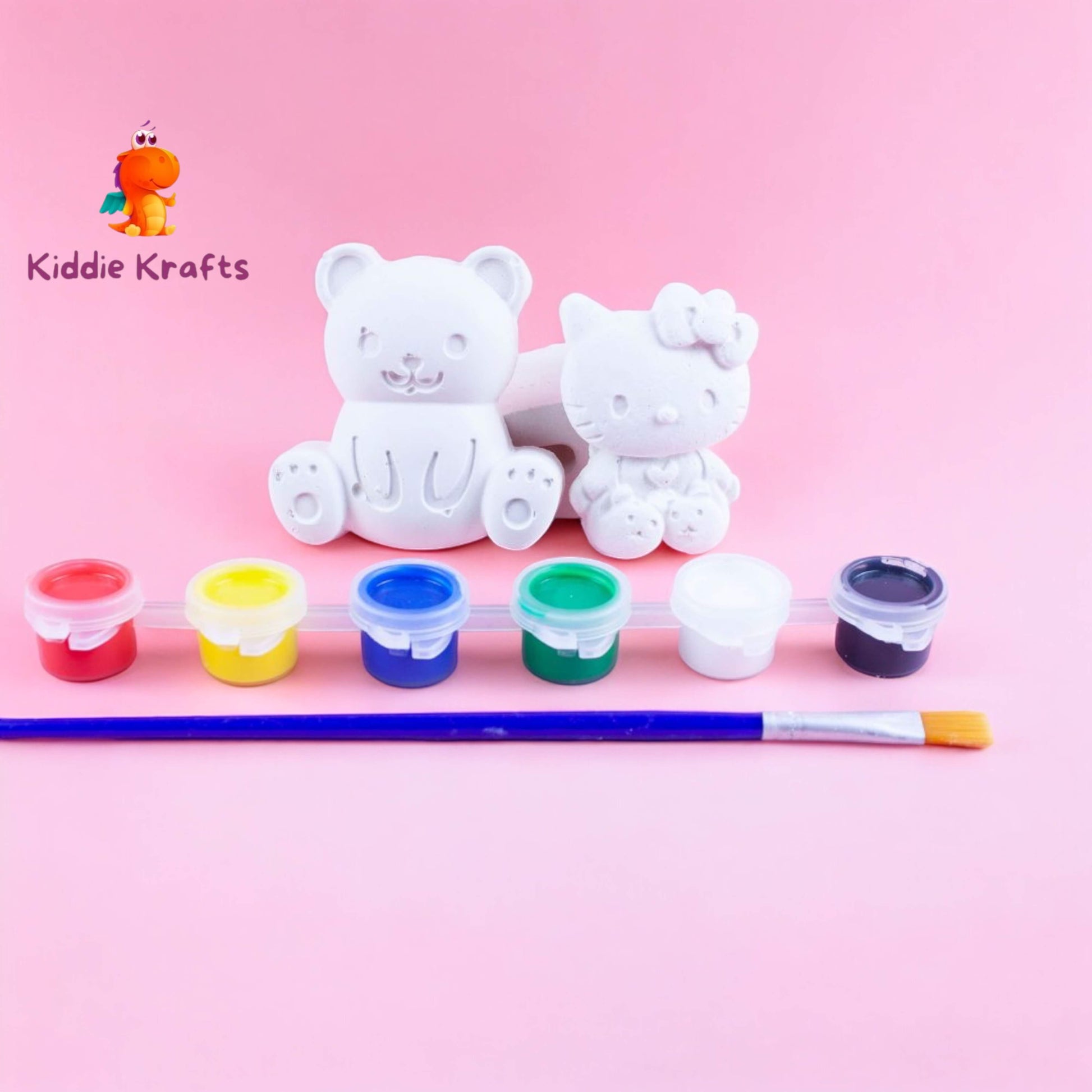 - 6 Paint Tubs: A vibrant selection of non-toxic paints to decorate the teddy and kitty.
